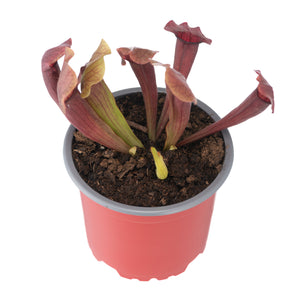 The Sarracenia x Maroon plant is a hybrid ofS. purpurea x rubra. It has an eye-catching deep maroon color on its short, curving pitchers. When the plant matures, the pitchers turn a dark red and retain their dark red colour even in winter. The plant gets red, fragrant, flowers in early Spring.